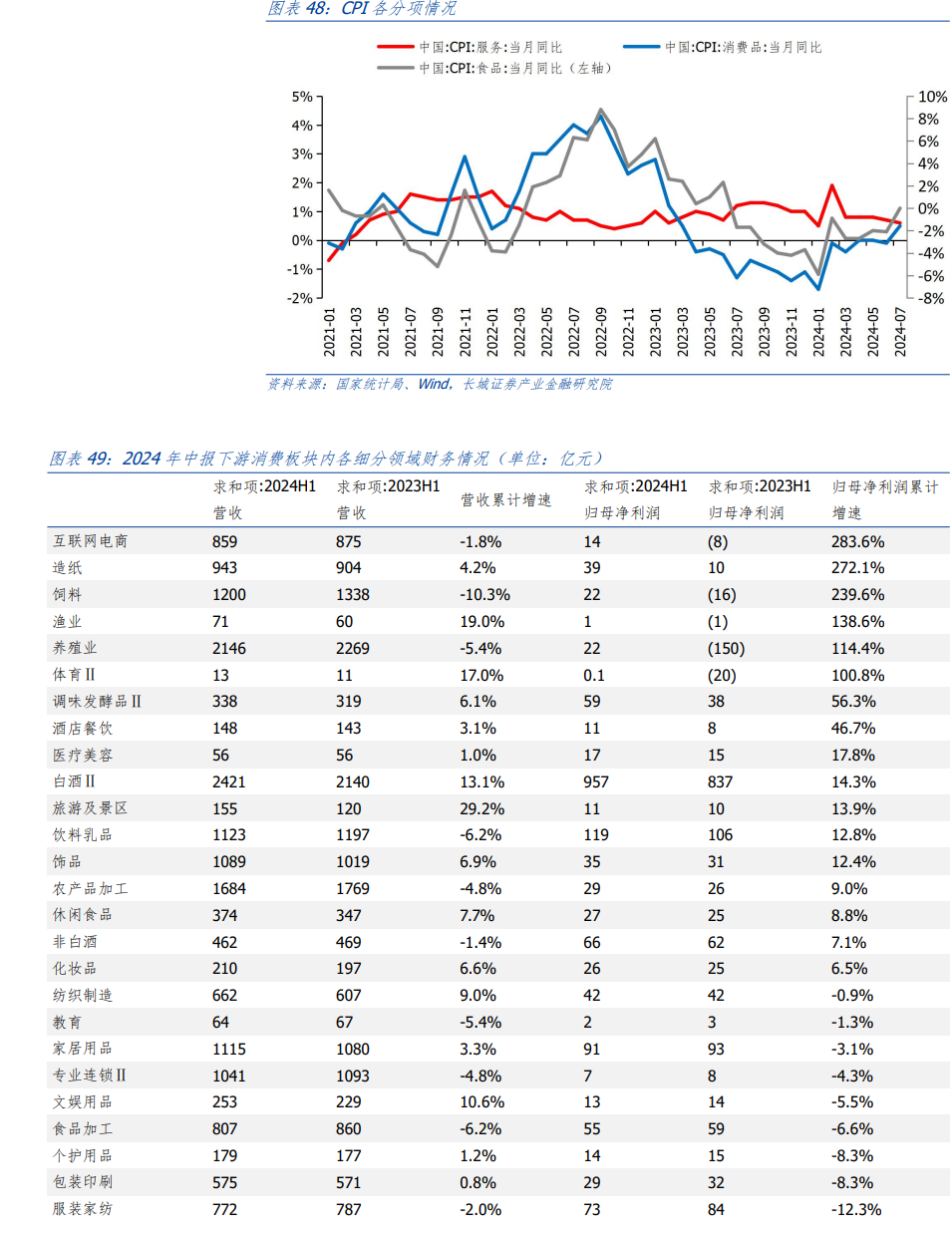 近期,食品CPI同比上升较多,服务CPI同比小幅下滑。比较CPI同比各分项情况,2024年7月服务CPI同比0.60%,消费品CPI同比 0.50%,食品CPI同比 0.00%;近期,消费品和食品CPI呈现修复态势,但从数值上看,服务CPI仍高于消费品和食品,且服务CPI同比较为稳定。比较各细分行业业绩,按净利润增速从高到低排序(排除业绩由亏转盈),调味发酵品排名靠前,2024年中报行业营收增速6.1%,归母净利润增速56.3%,彰显了上半年调味发酵品需求稳定增长且行业拥有不俗的盈利能力。2024上半年,旅游及景区营收增速29.2%,归母净利润增速13.9%。