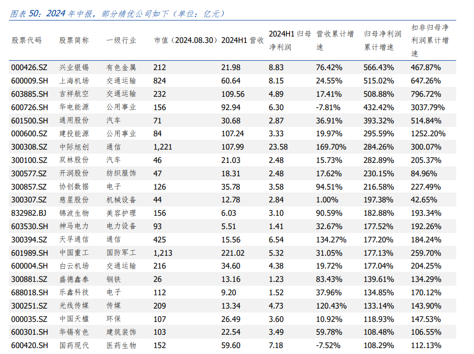 考虑到具备一定盈利规模、业绩增长、且增速同比上升,按照2024年中报归母净利润增速排序,优选部分绩优公司,图表请看正文。