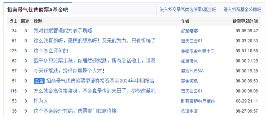 面对如此产品,持有基金份额的投资者们早已在基金论坛中对基金经理进行了一波又一波的“声讨”,质疑基金经理高位接盘的操作,甚至还有网友调侃说,如果和基金经理的交易方向相反,恐怕早就实现财富自由了。希望招商景气优选A在后市中能够支棱起来,做对一次选择,真正地投资高景气的成长行业。