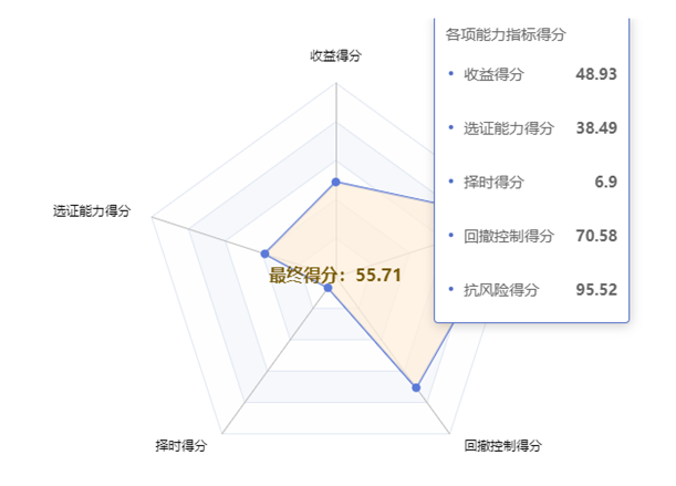 复盘基金经理的整个操作思路,从光伏到医药消费再到银行,似乎是哪个板块涨就去追哪个板块,名曰其名是右侧交易,但却往往是接了结构化行情的最后一棒。基金经理几乎不考虑择时以及交易拥挤度的风险,投资快报记者打开南财基金通的基金评价系统可以发现,招商景气优选A的择时能力得分仅为可怜的个位数,付斌每次调仓换股都买在板块交投情绪的高点,然后吃满一波回撤,再被迫调仓至下一个板块,周而复始,如果不是配置了银行股强行拉高了基金评价的抗风险能力,恐怕这个综合得分还要继续打折。