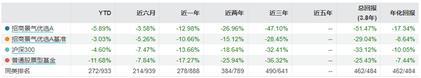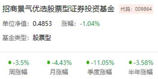 9月A股市场出师不利,沪指再度跌破2800,近几个月似乎每逢月底A股放量大涨之后,都会迎来一段时间的缩量回调,8月30日的放量大涨也不意外。股市在8月底“短暂景气”了一天,基金也可以“短暂景气”。投资快报记者从南财基金通数据观察发现,招商景气优选A(009864)成立于2020年11月18日,产品发行至今只“短暂景气”了三个月,基金在2021年2月10日单位净值达到1.21元的高点后,净值曲线就一路向下,从2021年的8月份开始,整整三年的时间,基金单位净值再也没能回到1元线上方。拉长周期来看,招商景气优选A成立近4年亏损超过50%,这回报率与“景气优选”一点都不沾边。