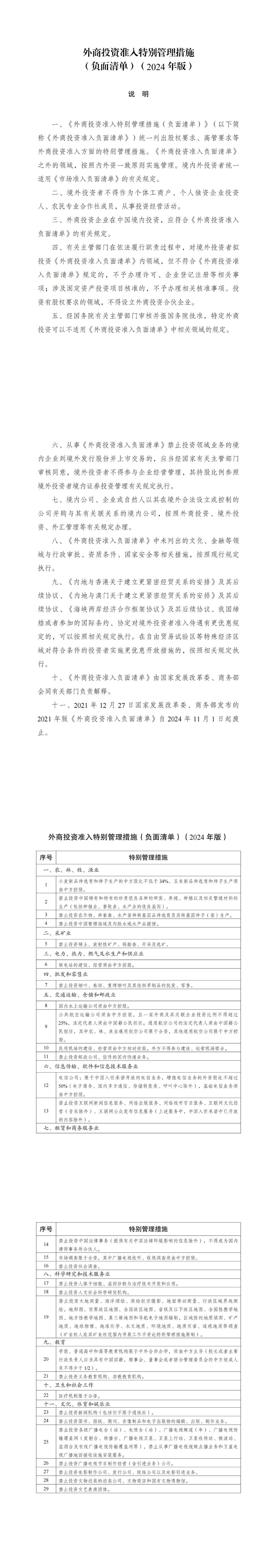 《外商投资准入特别管理措施(负面清单)(2024年版)》已经2024年4月8日国家发展和改革委员会第10次委务会议审议通过和商务部审签,并经党中央、国务院同意,现予发布,自2024年11月1日起施行。