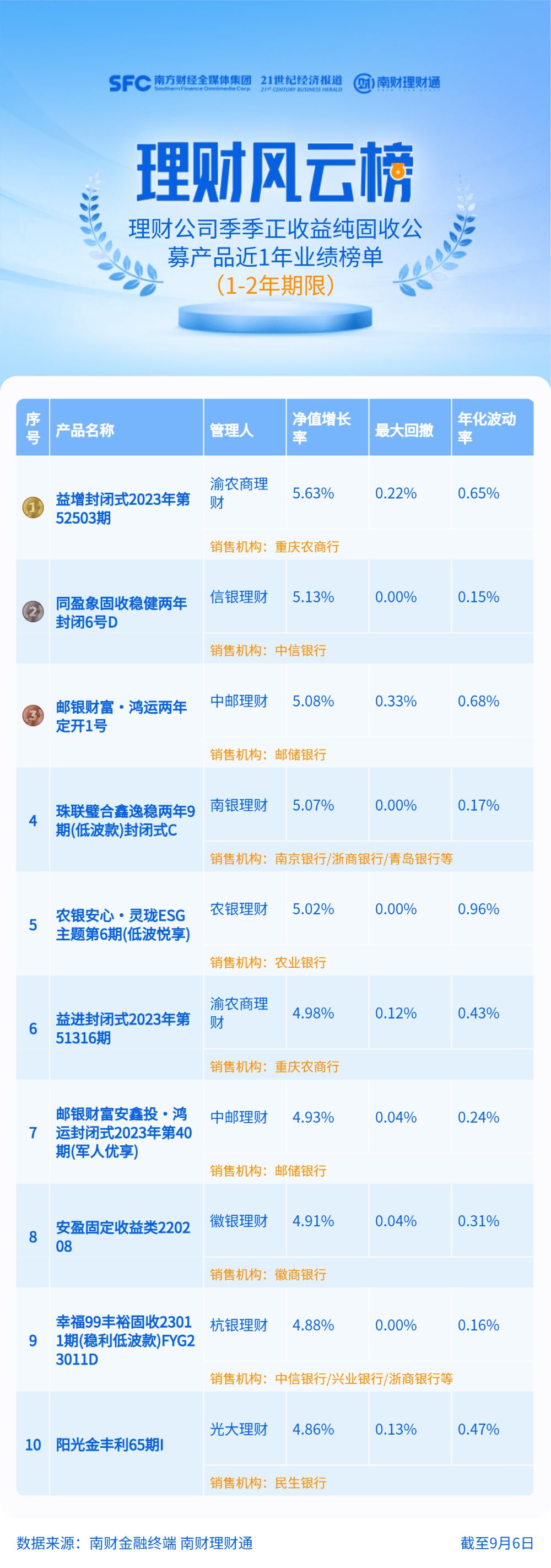 榜单筛选条件:理财公司发行的投资周期在1—2年(含)的纯固收公募产品,且近1年每个完整的自然季均为正收益,同系列同投资周期保留一只。