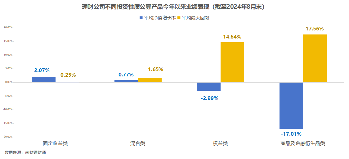 从收益情况来看,南财理财通数据显示,截至8月31日,固定收益类、混合类、权益类和商品及金融衍生品类公募理财今年以来平均净值增长率分别为2.07%、0.77%、-2.99%和-17.51%。