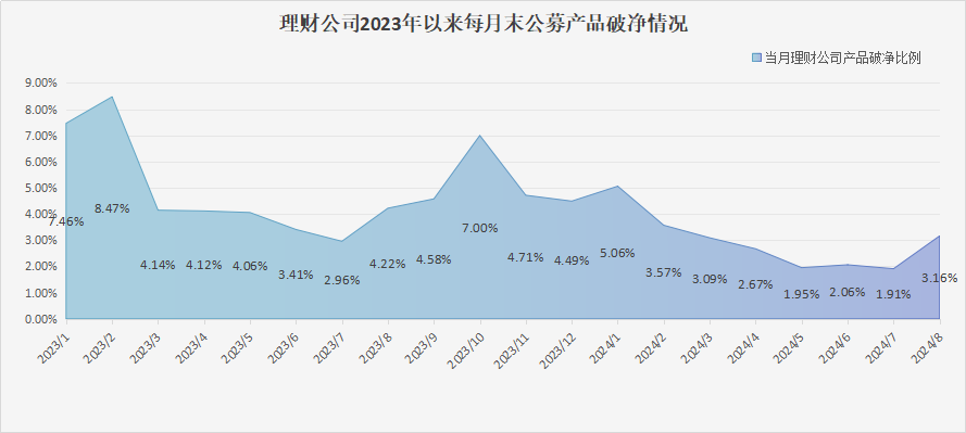 南财理财通数据显示,截至8月末,理财公司存续公募产品数量为18,829只,合计595只累计净值在1以下,综合破净率为3.16%,升至近半年最高。