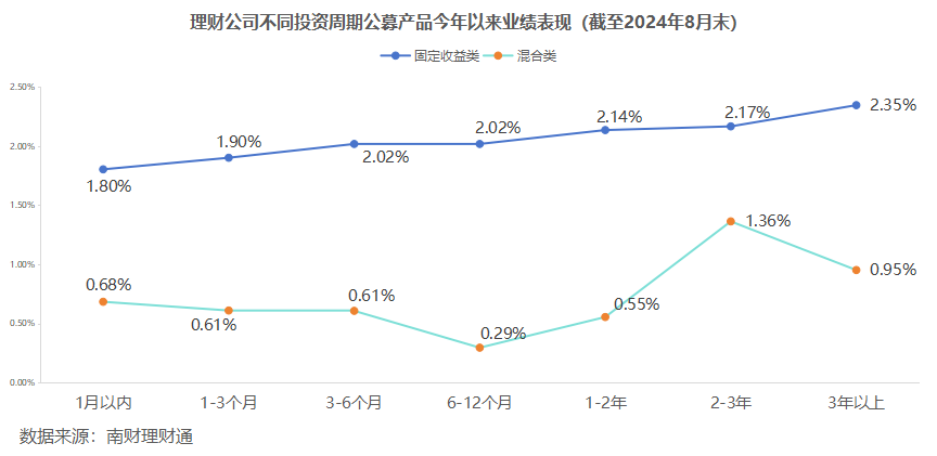 分投资周期看,截至8月31日,在固定收益类公募产品中,各期限产品今年以来净值增长率情况基本符合期限溢价,即投资周期越长、平均净值增长率越高,其中3年以上年投资周期固定收益类产品今年以来平均净值增长率最高,为2.35%。