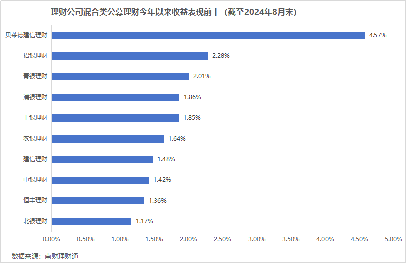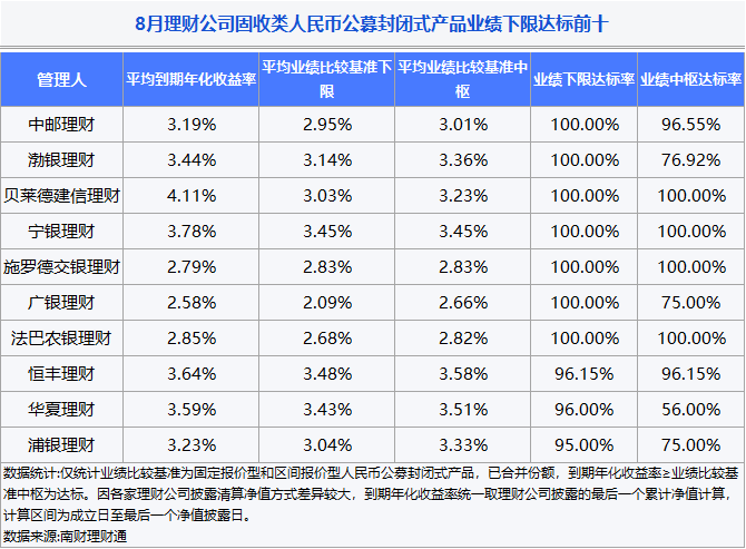 分机构来看,据南财理财通数据,截至8月31日,理财公司人民币固收类公募产品今年以来平均净值增长率为2.05%。贝莱德建信理财、渤银理财和恒丰理财今年以来固收产品平均净值增长率位列前三,依次为2.77%、2.72%和2.64%。