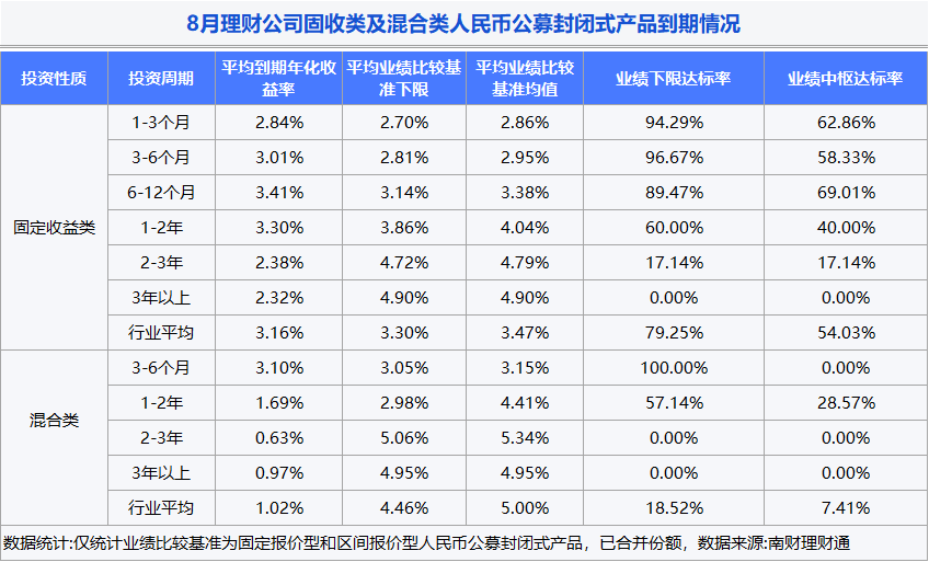 在固定收益类产品中,有315只到期年化收益达到业绩比较基准中枢,占比54.03%,较7月下降0.79个百分点,业绩下限达标率为79.25%,一年以内各期限产品下限达标率接近或超过90%,3—6个月期限产品达标率最高,为96.67%,其次为1—3个月期限产品,业绩下限达标率为94.29%。长期限产品达标率较为惨淡,2—3年期限和3年以上期限封闭式产品业绩下限达标率均低于20%,后者业绩下限达标率为零。混合类5只产品达到业绩比较基准下限,其中2只达到业绩比较中枢。