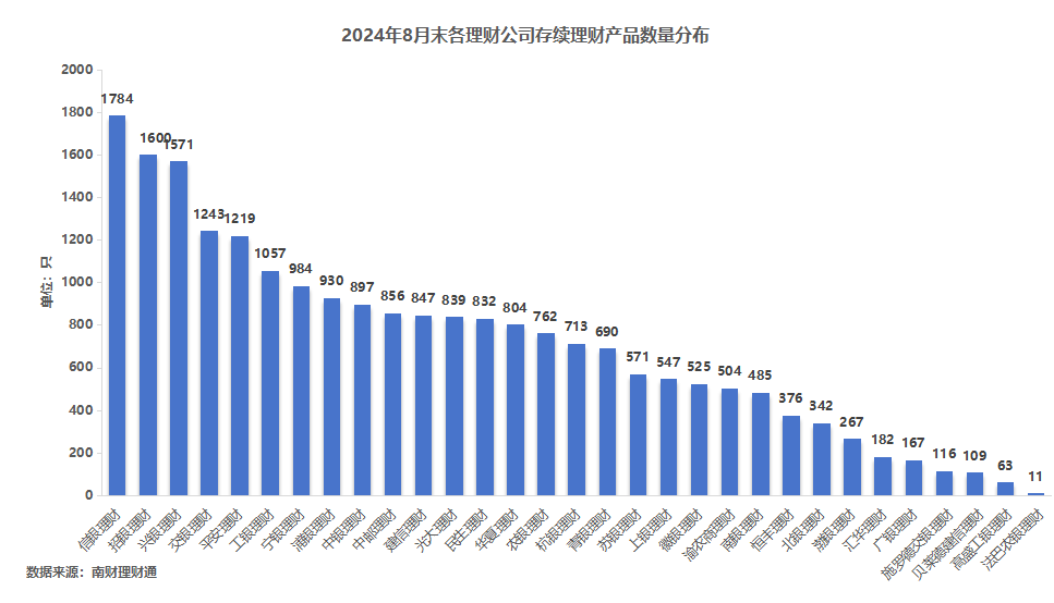 按管理人来看,信银理财、招银理财和兴银理财的存续产品数量包揽前三,分别为1,784只、1,600只和1,571只。