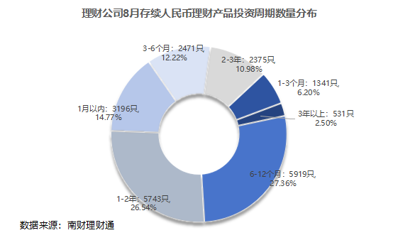 从投资周期来看,投资周期在6—12个月、1—2年的存续产品数量较多,分别为5919只、5743只,即投资周期在6个月-2年的产品数量占总量比例为53.9%,数量占比超五成。