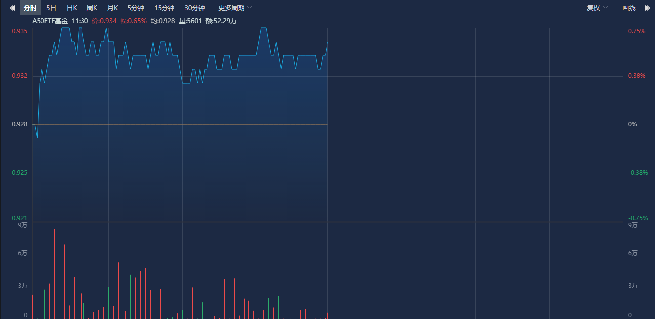 相关ETF方面,A50ETF基金(159592)早盘收涨0.65%,成交额超2亿元,居同标的产品首位,换手率近5%,早盘交投活跃,溢折率0.03%,早盘溢价。