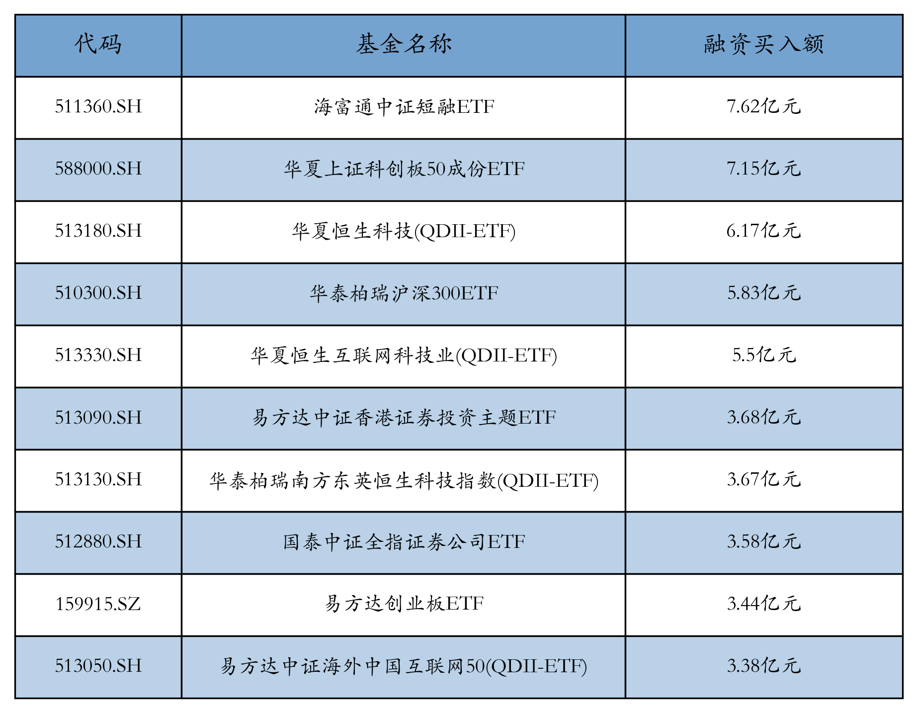 9月25日ETF融资买入额前三位分别为:海富通中证短融ETF(7.62亿元)、华夏上证科创板50成分ETF(7.15亿元)和华夏恒生科技(QDII-ETF)(6.17亿元),前10具体见下表: