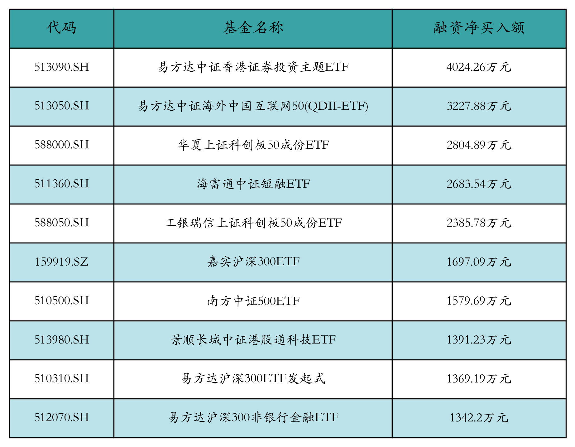 9月25日ETF融资净买入额前三位分别为:易方达中证香港证券投资主题ETF(4024.26万元)、易方达中证海外中国互联网50(QDII-ETF)(3227.88万元)和华夏上证科创板50成分ETF(2804.89万元),前10具体见下表: