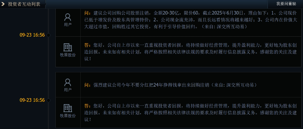事实上,这是牧原股份近两年第二次大额回购计划,2023年以自有资金回购股份近20亿元。此外,牧原股份控股股东及实际控制人之子、部分董监高及核心人员还自愿增持了公司股票。