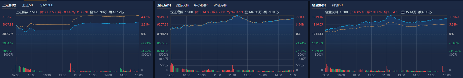 9月27日,市场继续大涨,沪深两市成交额合计14460亿元。创业板指涨10%创历史单日最大涨幅,创业板指全天成交4395亿元,成交金额也创出历史天量。深成指全天成交额接近万亿元。南财金融终端显示,截至收盘,沪指涨2.89%,深成指涨6.71%,创业板指涨10%。