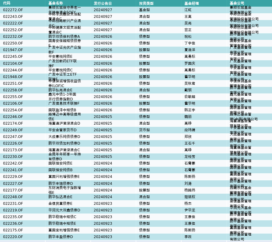 上周有35只新基金发行,分别为:景顺长城保守养老一年持有混合FOFY、中邮军民融合灵活配置混合C、中邮战略新兴产业混合C、中邮健康文娱灵活配置混合C、鹏华双债保利债券A、国寿安保超短债债券E、广发中证光伏产业指数F、平安惠悦纯债E、广发创新药ETF联接F、平安惠悦纯债C、广发中证军工ETF联接F、中信保诚增强收益债券(LOF)C、鹏华弘尚混合E、鑫元中债1—3年国开行债券指数D、广发信息技术联接F、国联盈泽中短债B、路博迈中高等级信用债E、海富通沪港深混合D、平安金管家货币D、大成景乐纯债债券D、鹏华双债加利债券D、海富通沪港深混合C、金鹰年年邮享一年持有债券D、国联恒安纯债E、国联恒安纯债B、富国兴利增强债券E、鹏华丰瑞债券D、东财消费电子指数增强E、鹏华弘达混合E、金信民富债券E、华润元大双鑫债券D、鹏华稳瑞中短债C、鹏华稳瑞中短债E、富国宝利增强债券E、鹏华丰盈债券D,详情见下表:
