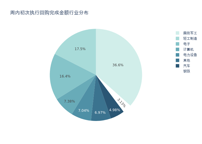 按照初次执行金额所在不同行业分布,金额最高的3个行业分别为:国防军工、轻工制造、电子,详情见下图:
