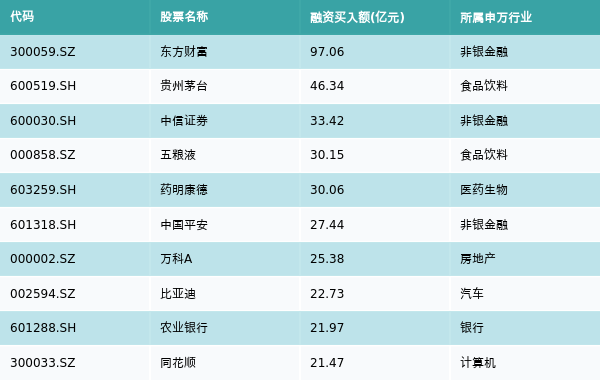 上周两市共有3363只个股有融资资金买入,共有56只个股买入金额超10亿元,其中东方财富、贵州茅台、中信证券排名前三,买入金额分别97.06亿元、46.34亿元、33.42亿元。融资买入额前10个股详情见下表:
