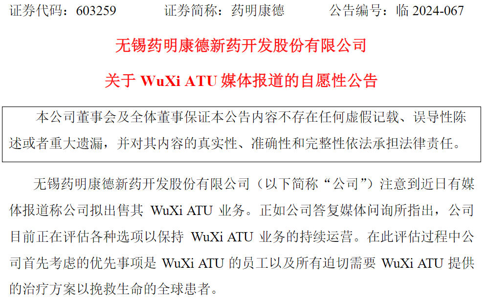 10月8日早间,药明康德(603259.SH)发布公告称,公司注意到近日有媒体报道称本公司拟出售其WuXi ATU业务。截至本公告日,公司并未就上述事项形成任何决议,亦并未与任何相关方签署任何有约束力的实质性协议。公司最终是否选择出售WuXi ATU业务或者保留并执行使该业务得以持续运营的其他选项均存在不确定性。