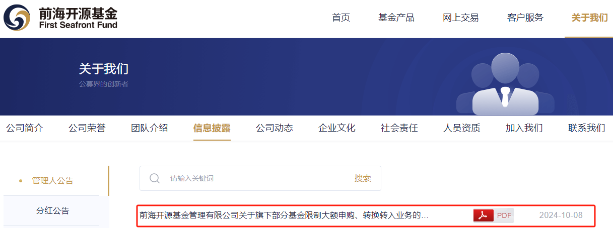 10月8日凌晨,前海开源基金发布《关于旗下部分基金限制大额申购、转换转入业务的公告》称,即日起,对旗下74只基金采取限购,单日每个基金账户累计申购公告内所涉单只基金的最高金额调整为1000元。此次限购所涉及的基金,主要为前海开源基金旗下持有A股股票及可转债的基金。