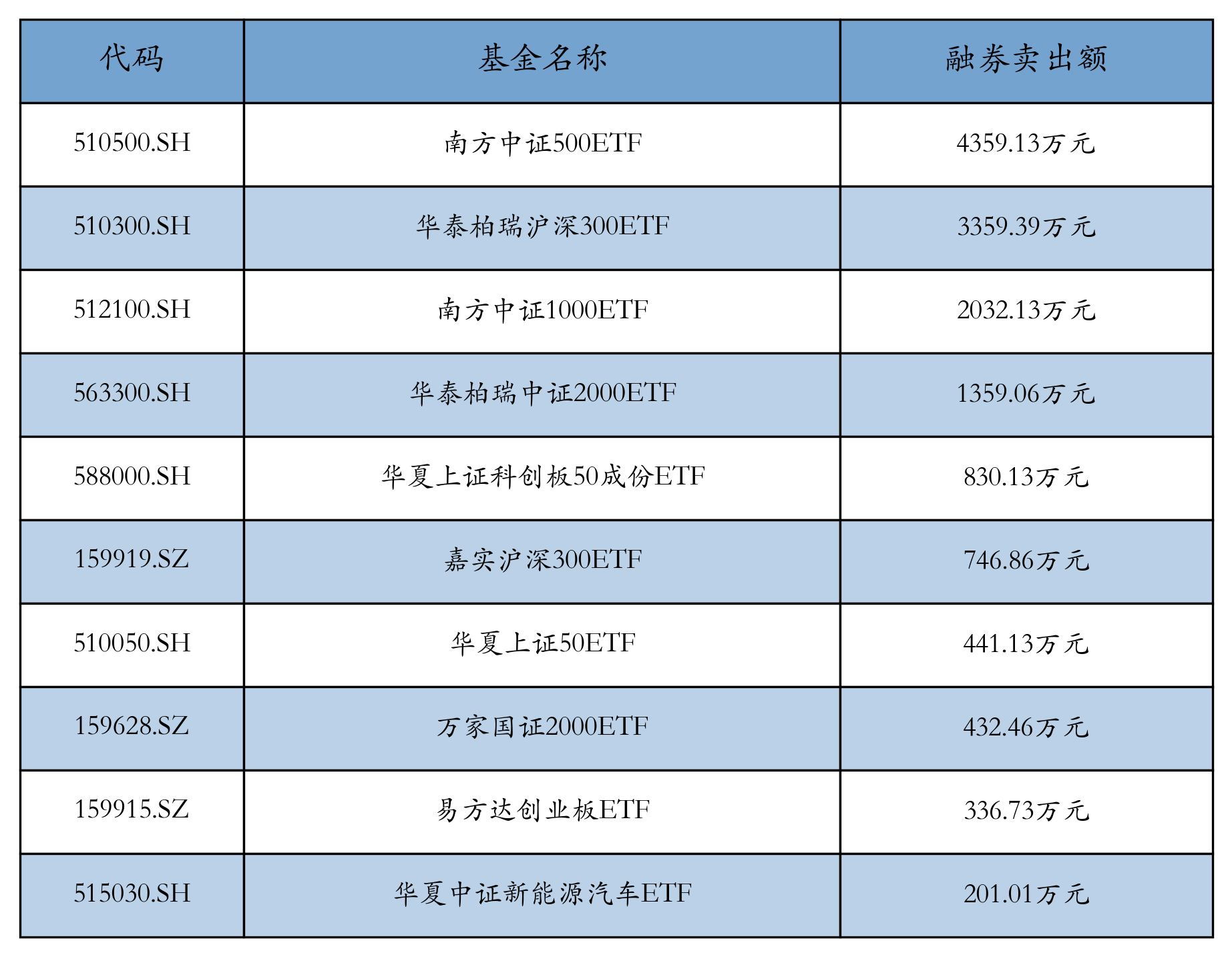 10月8日,ETF融券卖出额前三位分别为:南方中证500ETF(4359.13万元)、华泰柏瑞沪深300ETF(3359.39万元)和南方中证1000ETF(2032.13万元),前10具体见下表: