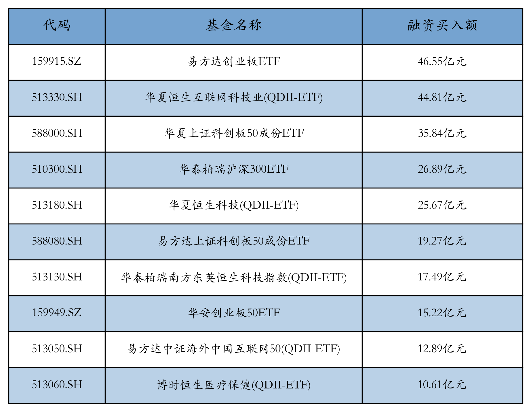 10月8日,ETF融资买入额前三位分别为:易方达创业板ETF(46.55亿元)、华夏恒生互联网科技业(QDII-ETF)(44.81亿元)和华夏上证科创板50成份ETF(35.84亿元),前10具体见下表: