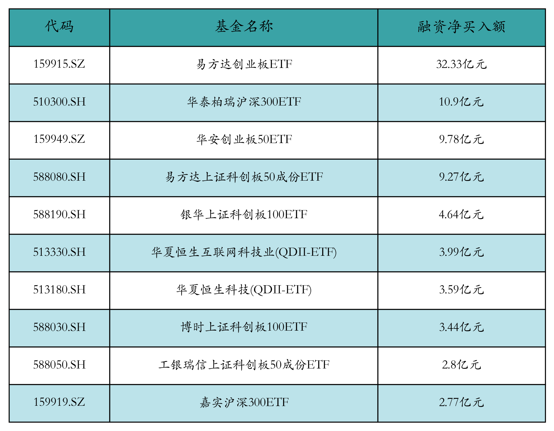 10月8日,ETF融资净买入额前三位分别为:易方达创业板ETF(32.33亿元)、华泰柏瑞沪深300ETF(10.9亿元)和华安创业板50ETF(9.78亿元),前10具体见下表: