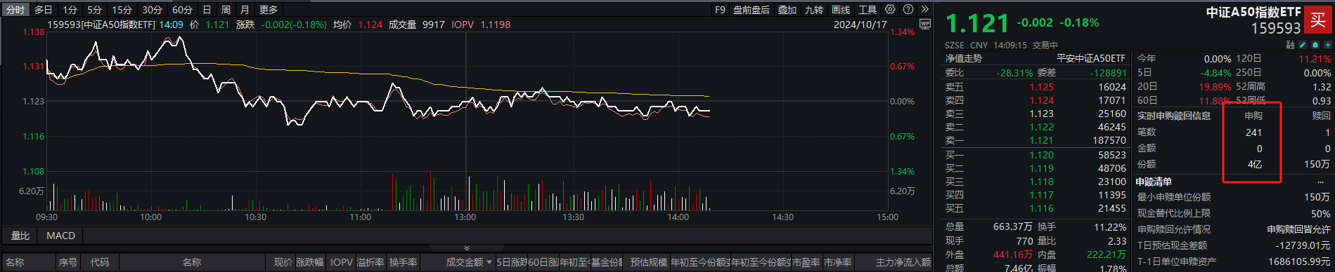 10月17日,市场午后有所回落,沪指翻绿,深成指涨幅小幅收窄。中证A50指数跌幅进一步扩大,截至发稿跌超0.3%,成分股中,科大讯飞、爱尔眼科涨超4%,珀莱雅、福耀玻璃、智飞生物、紫光股份涨超2%,北方华创、恒瑞医药、中兴通讯涨超1%。