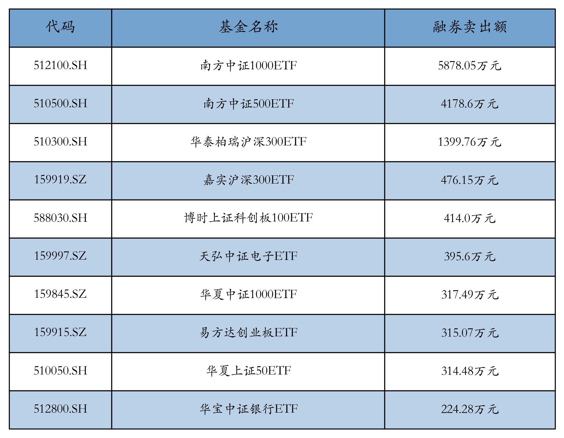 10月17日ETF融券卖出额前三位分别为:南方中证1000ETF(5878.05万元)、南方中证500ETF(4178.6万元)和华泰柏瑞沪深300ETF(1399.76万元),前10具体见下表: