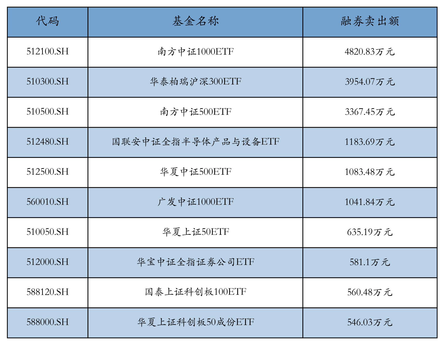 10月18日ETF融券卖出额前三位分别为:南方中证1000ETF(4820.83万元)、华泰柏瑞沪深300ETF(3954.07万元)和南方中证500ETF(3367.45万元),前10具体见下表: