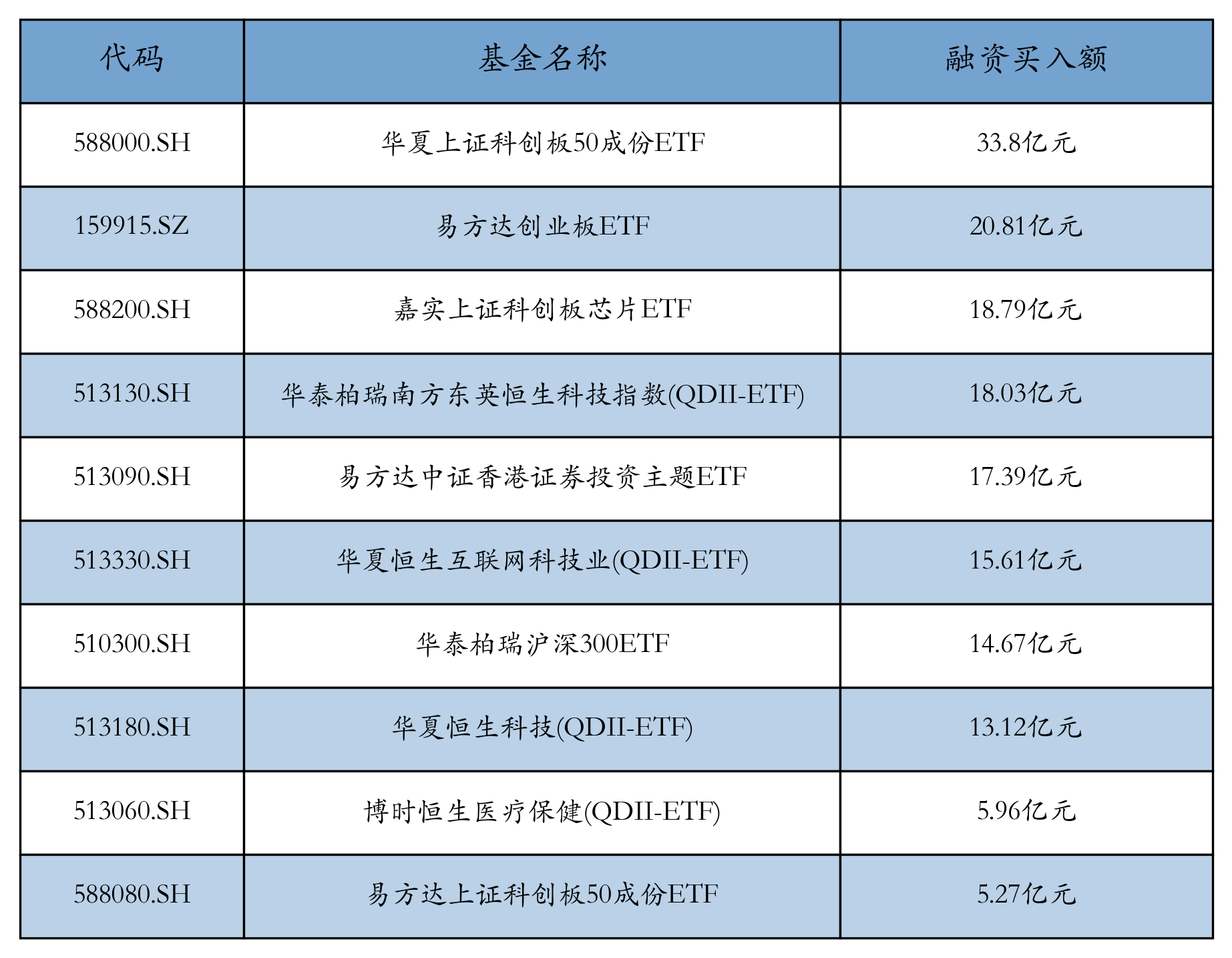 10月18日ETF融资买入额前三位分别为:华夏上证科创板50成份ETF(33.8亿元)、易方达创业板ETF(20.81亿元)和嘉实上证科创板芯片ETF(18.79亿元),前10具体见下表: