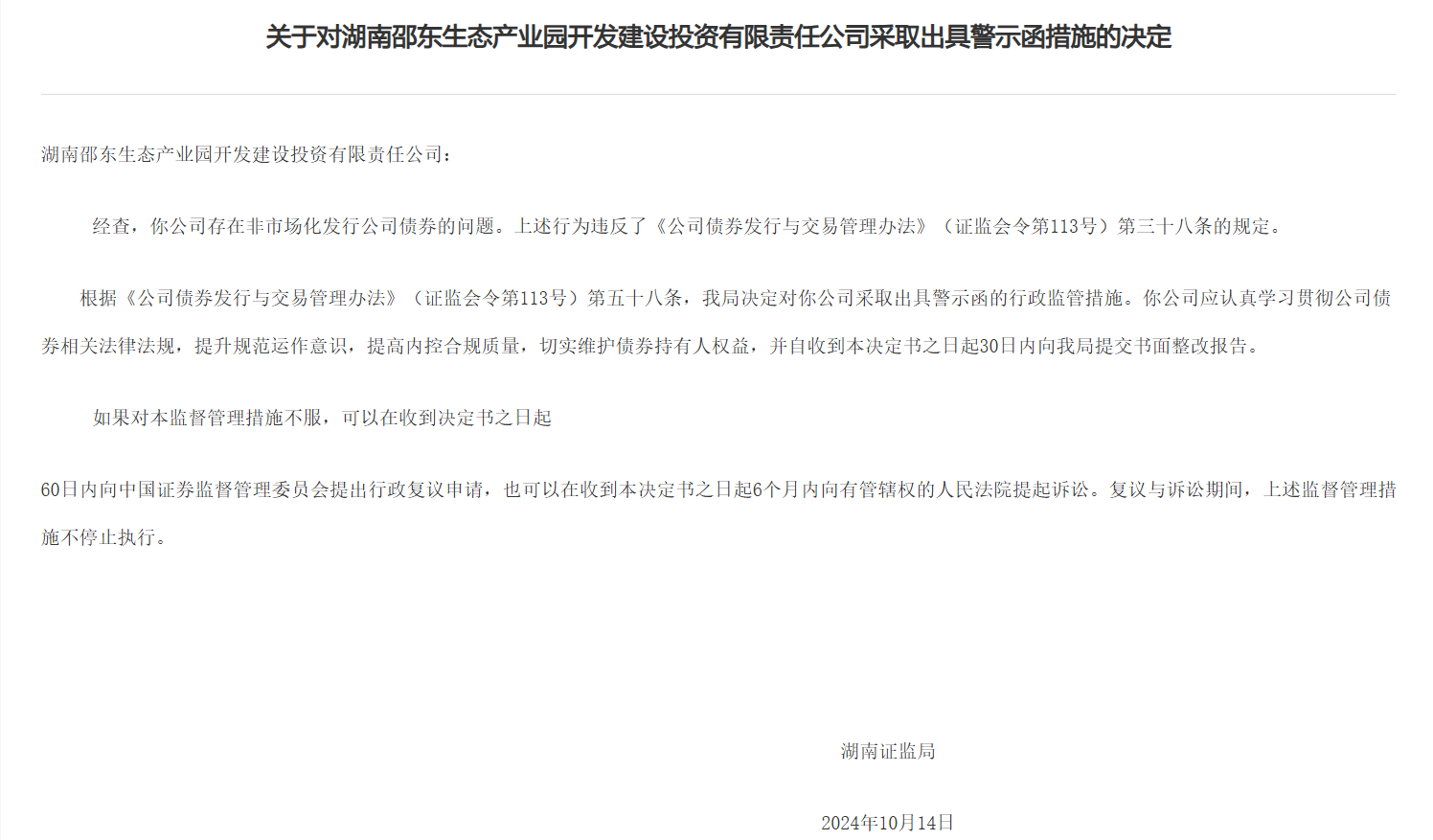 10月14日,湖南证监局发布《关于对湖南邵东生态产业园开发建设投资有限责任公司采取出具警示函措施的决定》。其公告内容称,公司存在非市场化发行公司债券的问题,违反了《公司债券发行与交易管理办法》(证监会令第113号)第三十八条的规定。