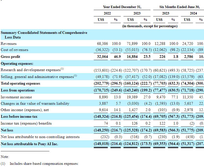 招股书显示,2022、2023年及2024年上半年,小马智行营收分别为6839万美元、7190万美元和2472万美元,累计营收超过1.65亿美元(约12亿元人民币),整体营收体量还不大。