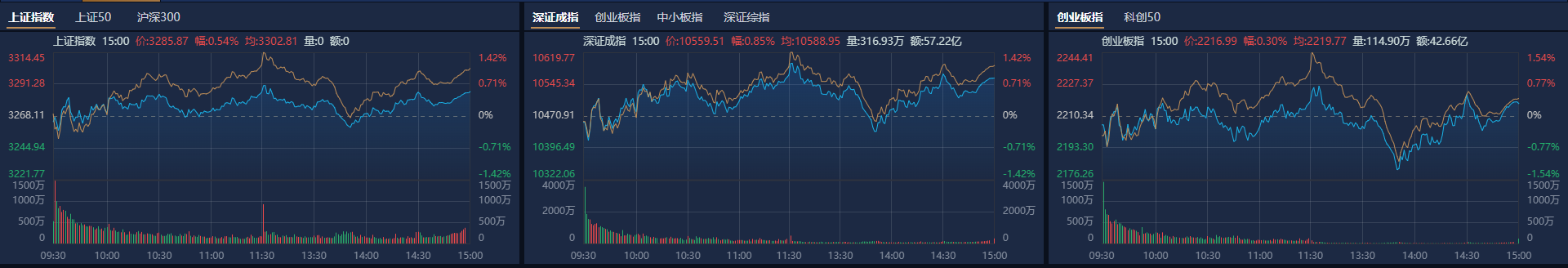 10月22日,市场全天震荡反弹,三大指数小幅上涨。北证50指数盘中巨震,收盘大跌超7%。南财金融终端显示,截至收盘,沪指涨0.54%,深成指涨0.85%,创业板指涨0.3%。