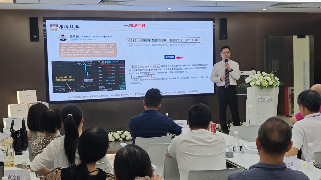 为引导投资者理性看待市场,提振投资者信心,来自华源证券广东分公司的首席投顾王君毅老师更是给大家带来了《交投活跃度增加,2024年第四季度——主升浪如何把握?》的主题分享,王君毅老师从前期市场回顾、近期热点事件解读与在投资市场应当永远抱着学徒的心态等方面延伸出对2024年第四季度对投资市场的展望,帮助投资者理清投资思路,学习投资策略,进一步向投资者揭示投资的风险与机遇,引导投资者理性参与投资。