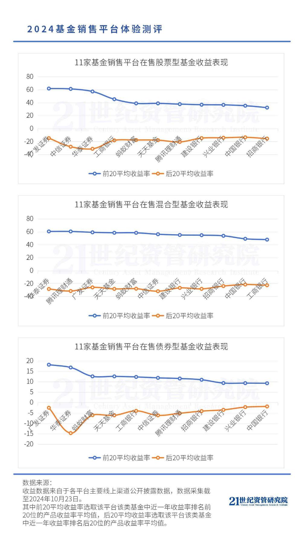 2024年9月-10月,21世纪资管研究院发起了对基金销售平台的体验测评,综合考虑规模情况,分别选取第三方平台3家、银行5家、券商3家共11家平台,以其线上销售的主力渠道APP为测评对象,围绕各家平台的选品能力、APP功能触达及功能设置、用户选品及投资体验等方面做出全面测评,基于测评报告,我们在每个维度的测评结果上提炼相关精华内容,对外公布,供投资者参考,本篇为该系列的第一篇,聚焦11家基金销售平台的选品能力。后续将分别聚焦APP功能触达及功能设置、用户选品及投资体验等进行发布。