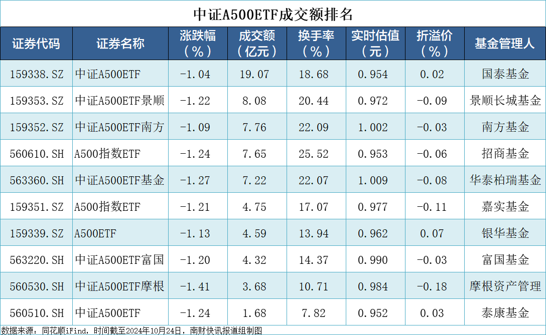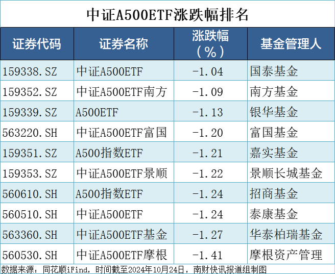 跌幅最少的分别是国泰中证A500ETF、南方中证A500ETF、银华A500ETF,分别跌1.04%、1.09%、1.13%。