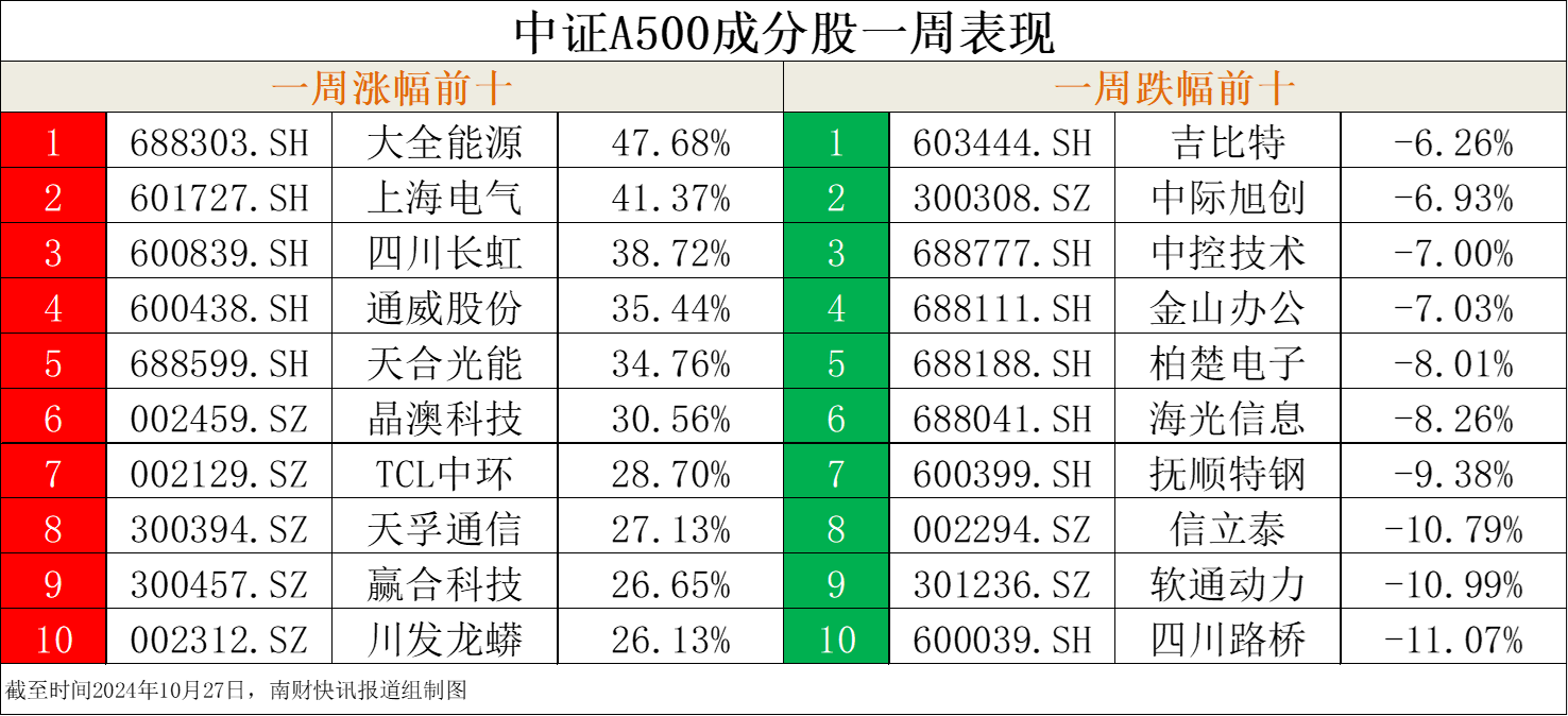 中证A500指数成分股一周涨幅前十、跌幅前十