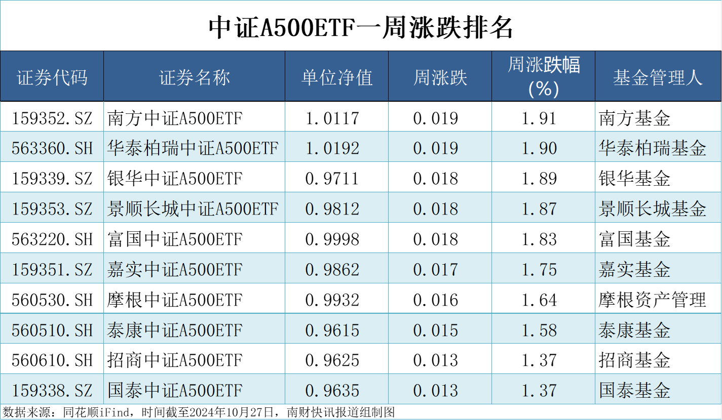 上周涨幅前三的分别是南方中证A500ETF、华泰柏瑞中证A500ETF、银华中证A500ETF,分别涨1.91%、1.90%、1.89%。