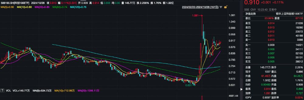 相关ETF方面,科创100ETF(588190)截至发稿涨0.11%,成交额超1.3亿元,换手率超2.2%,早盘交投活跃,溢折率0.03%,盘中频现溢价交易。Wind数据显示,截至10月25日,该ETF最新规模58.71亿元,最新流通份额64.61亿份。