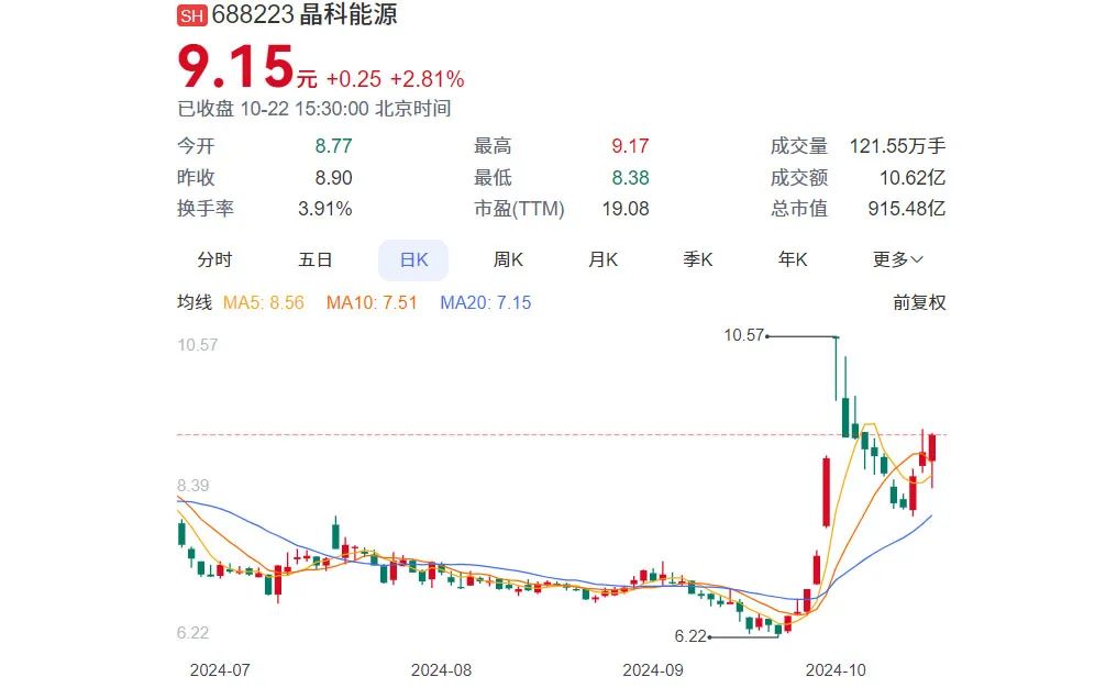 好在,出现回暖迹象,10月22日,晶科能源收盘报9.15元/股,总市值约915亿元,相较一个月前增长43%。