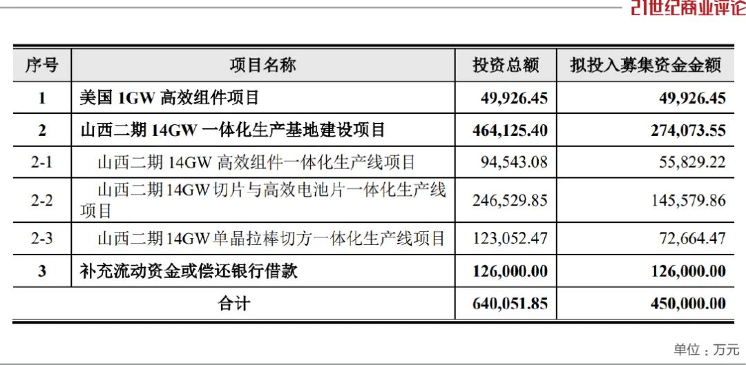 本次上市计划募资45亿元,主要用于美国1GW高效组件项目和山西二期14GW一体化生产基地建设项目。