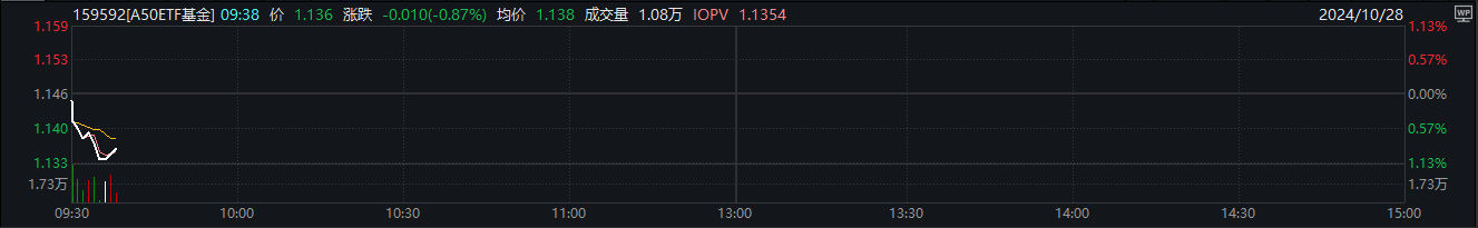 相关ETF方面,A50ETF基金(159592)低开低走,截至发稿下跌0.87%,成交额超1900万元,换手率0.46%,溢折率0.05%,盘中溢价。