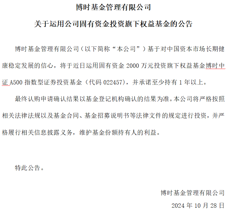 10月28日,南财快讯记者获悉,博时基金将于近日运用固有资金2000万元投资旗下中证A500指数基金,并承诺至少持有1年以上。据悉,这也是中证A500场外指数基金上市后首家自购。