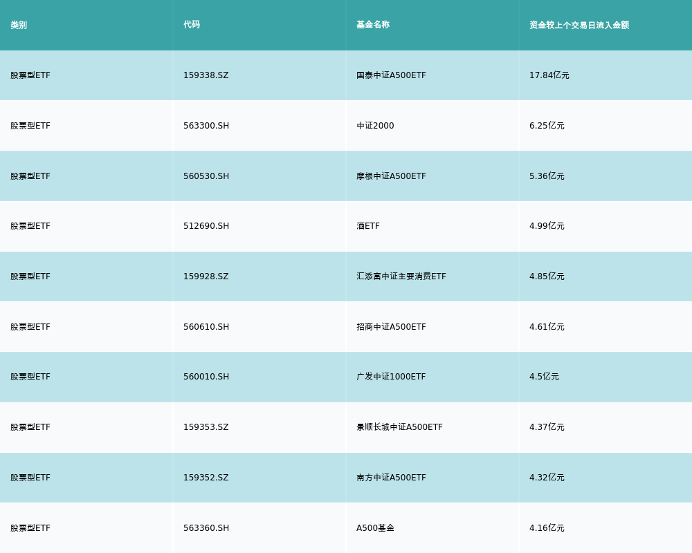 昨日股票型ETF资金流入最多的3支ETF及其流入金额分别为:国泰中证A500ETF(流入17.84亿元)、中证2000(流入6.25亿元)、摩根中证A500ETF(流入5.36亿元)。资金流入前10详情见下表: