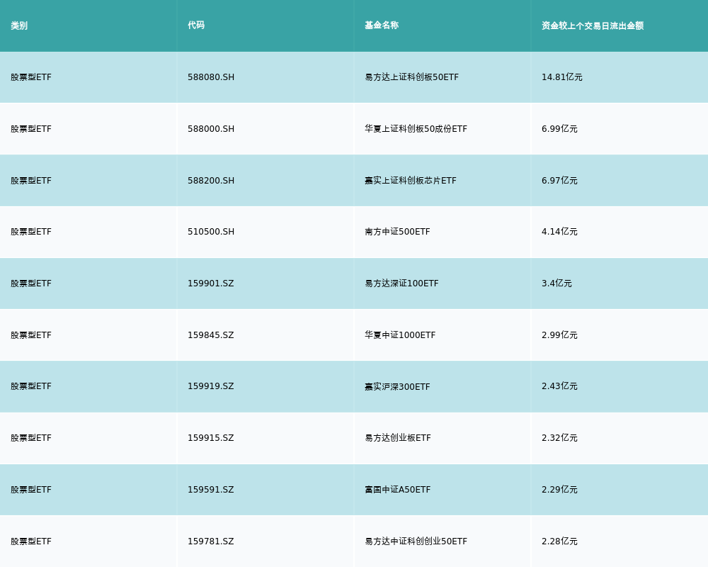 昨日股票型ETF资金流出最多的3支ETF及其流出金额分别为:易方达上证科创板50ETF(流出14.81亿元)、华夏上证科创板50成份ETF(流出6.99亿元)、嘉实上证科创板芯片ETF(流出6.97亿元)。资金流出前10详情见下表: