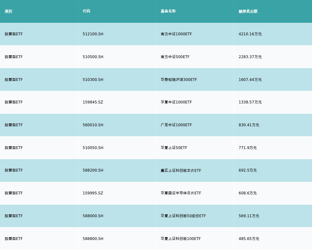 昨日股票型ETF融资卖出额最高的3支ETF及其卖出金额分别为:南方中证1000ETF(4210.16万元)、南方中证500ETF(2283.37万元)、华泰柏瑞沪深300ETF(1607.44万元)。融券卖出额前10详情见下表: