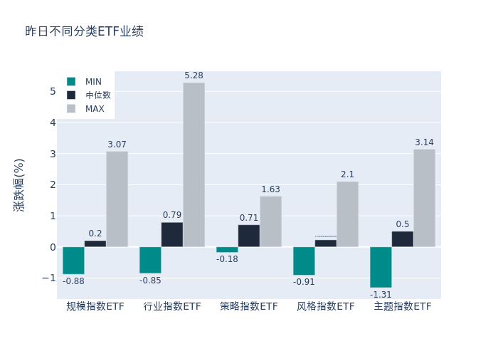 昨日股票型ETF收益率中位数为0.39%。其中按照不同分类,规模指数中汇添富中证2000ETF收益率最高,为3.07%;行业指数中国泰中证钢铁ETF收益率最高,为5.28%;策略指数中汇添富中证国新央企股东回报ETF收益率最高,为1.63%;风格指数中华夏中证智选1000价值稳健策略ETF收益率最高,为2.1%;主题指数中国泰中证影视主题ETF收益率最高,为3.14%。