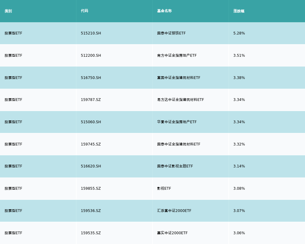昨日股票型ETF涨幅最高的3支ETF及其收益率分别为:国泰中证钢铁ETF(5.28%)、南方中证全指房地产ETF(3.51%)、富国中证全指建筑材料ETF(3.38%)。涨幅前10详情见下表: