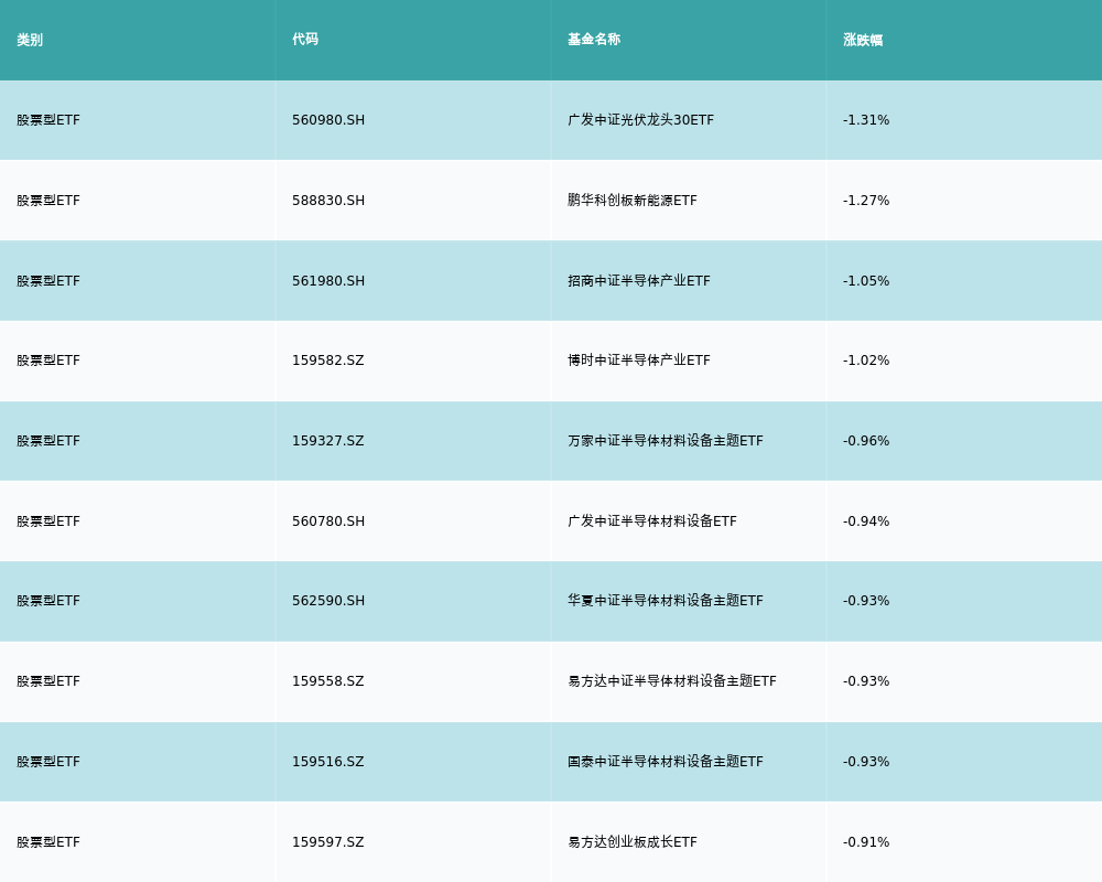 昨日股票型ETF跌幅最大的3支ETF及其收益率分别为:广发中证光伏龙头30ETF(-1.31%)、鹏华科创板新能源ETF(-1.27%)、招商中证半导体产业ETF(-1.05%)。跌幅前10详情见下表: